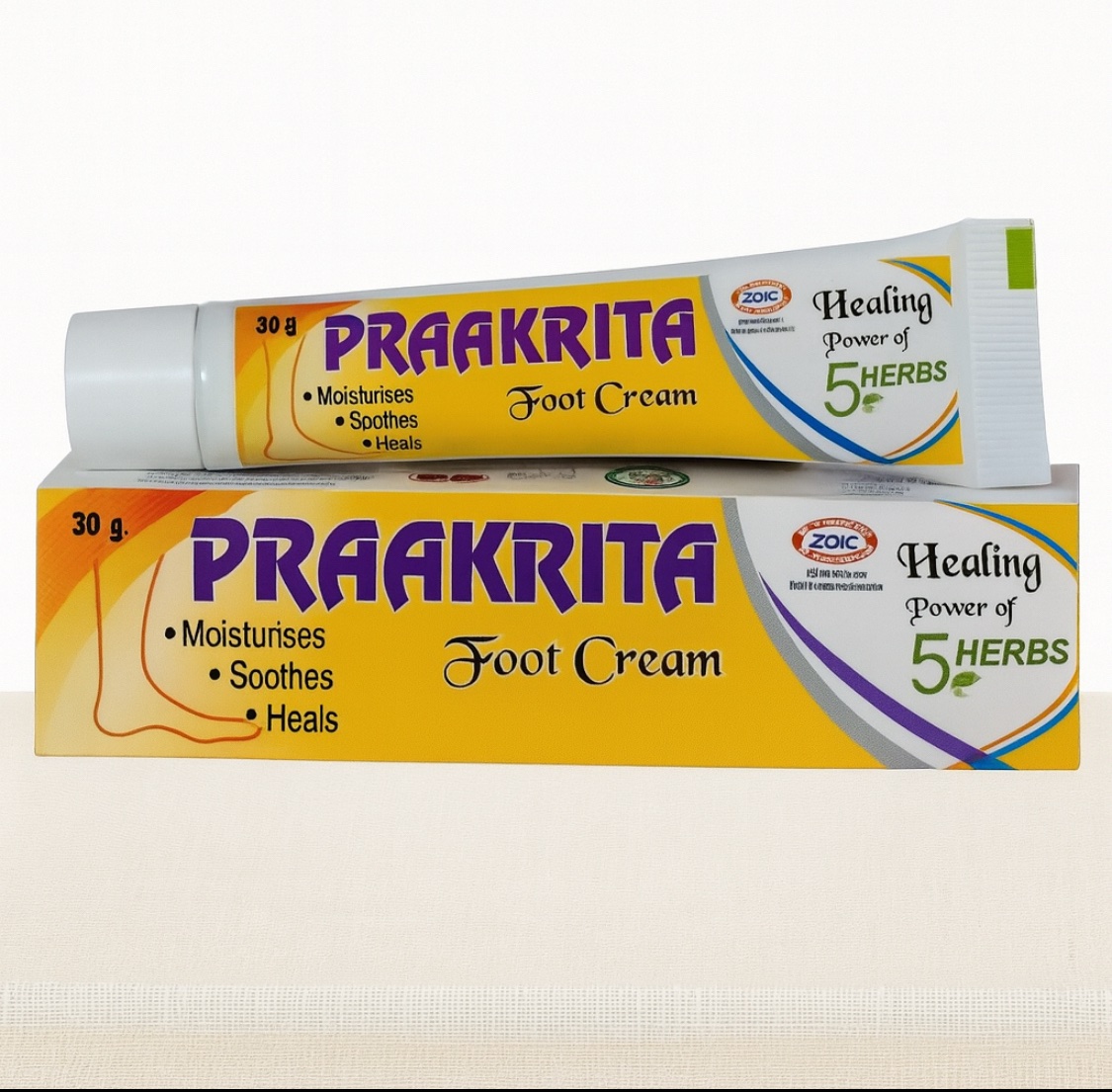 Zoic Praakrta Foot Cream is an Ayurvedic formulation crafted to restore softness and comfort to rough, cracked heels. Powered by a blend of natural actives—camphor for cooling relief, turmeric for healing, sal (teak) for nourishment, shuddha gandhak for its purifying effect, and shuddha tankan for soothing properties—this cream helps hydrate deeply, soften calloused skin, and repair deep fissures. Ideal for daily use, it leaves heels smooth and rejuvenated while strengthening the skin barrier for ongoing protection.